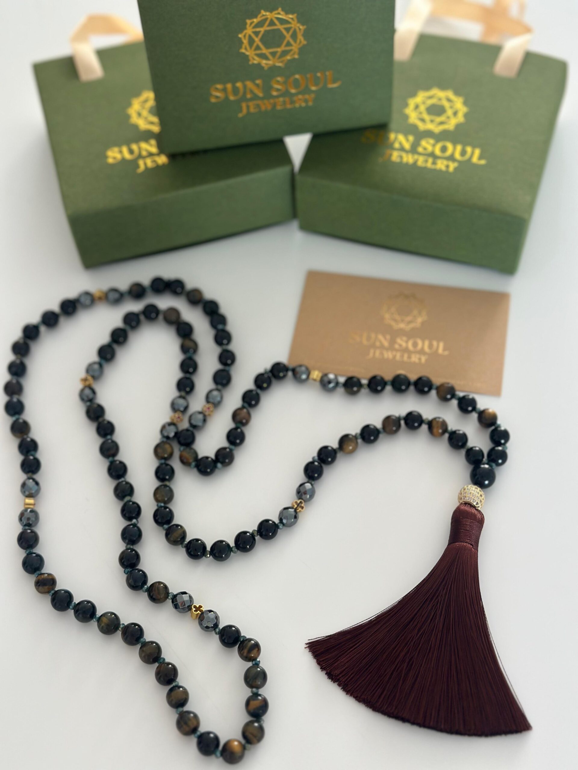 Tourmaline, onyx, hematite, hawk’s eye, crystals, gold-plated accessories, brown silk tail, Central accessory: Plated gold – plated bead, height and width 1.2*1.1cm